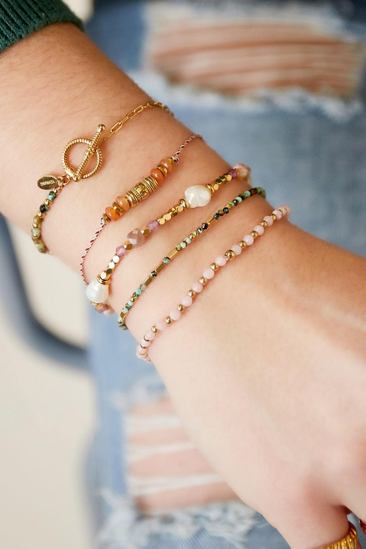 Armband slot en roze natuursteentjes. Goudkleurige armband met een kapittelslot en roze natuursteentjes. Shop hem samen met andere armbandjes, kettinkjes, oorbellen en ringen uit de natuurstenen collectie. Materiaal: Stainless steel en natuursteentjes.