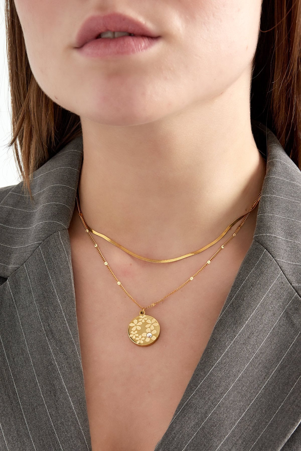 Dubbele ketting bloemenmunt. Deze dubbele ketting bestaat uit 1 laag ketting slang en 1 laag met een munthanger. Deze hanger is mooi versierd met bloemetjes en een strass steentje. De ketting is gemaakt van Stainless steel, dus verkleurt niet.