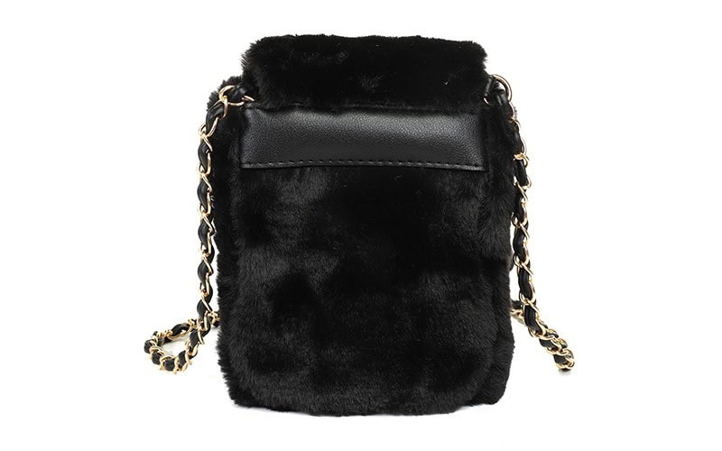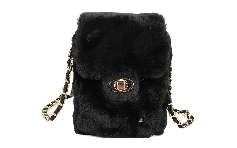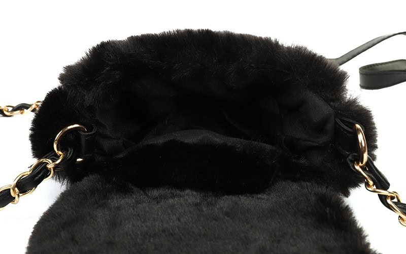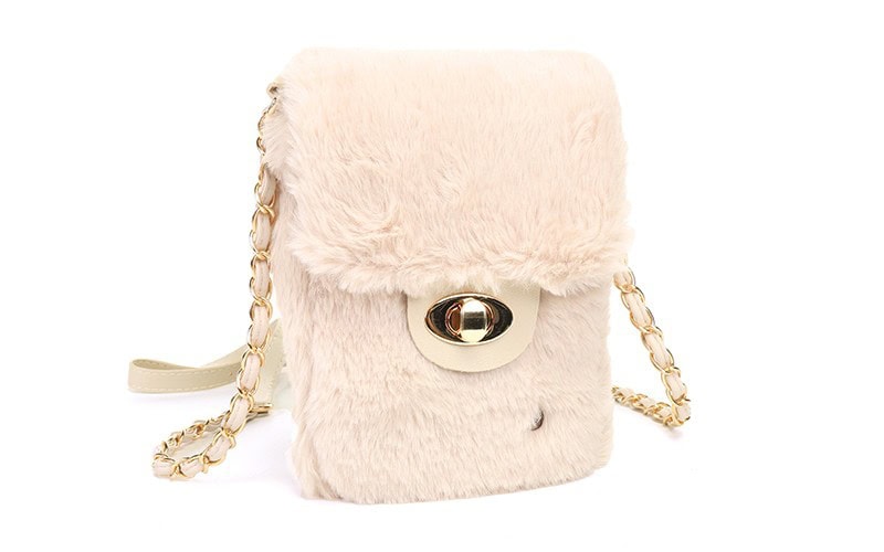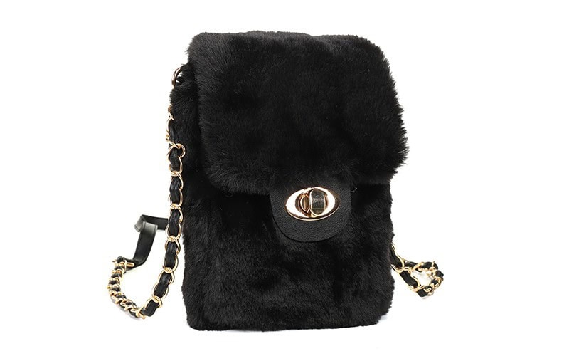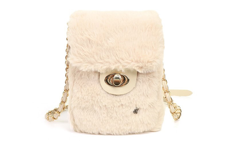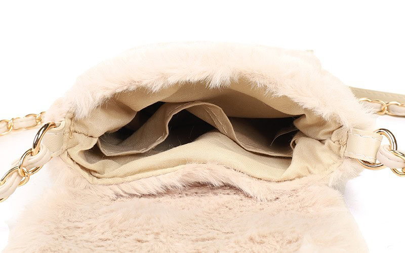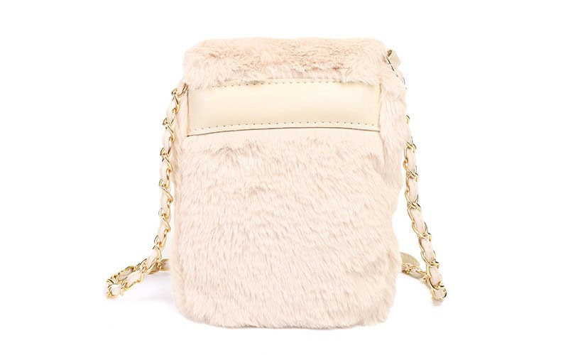 Dit compacte telefoontasje is ideaal voor het veilig en stijlvol opbergen van je kleine essentials. Door het zachte fluffy materiaal voelt dit tasje niet alleen heerlijk aan, maar is het ook een echte eyecatcher. De flap wordt afgesloten met een elegante gouden draaisluiting, waardoor je spullen veilig blijven. Het tasje heeft een metale ketting met daarin verwerkt PU materiaal die dient als band.