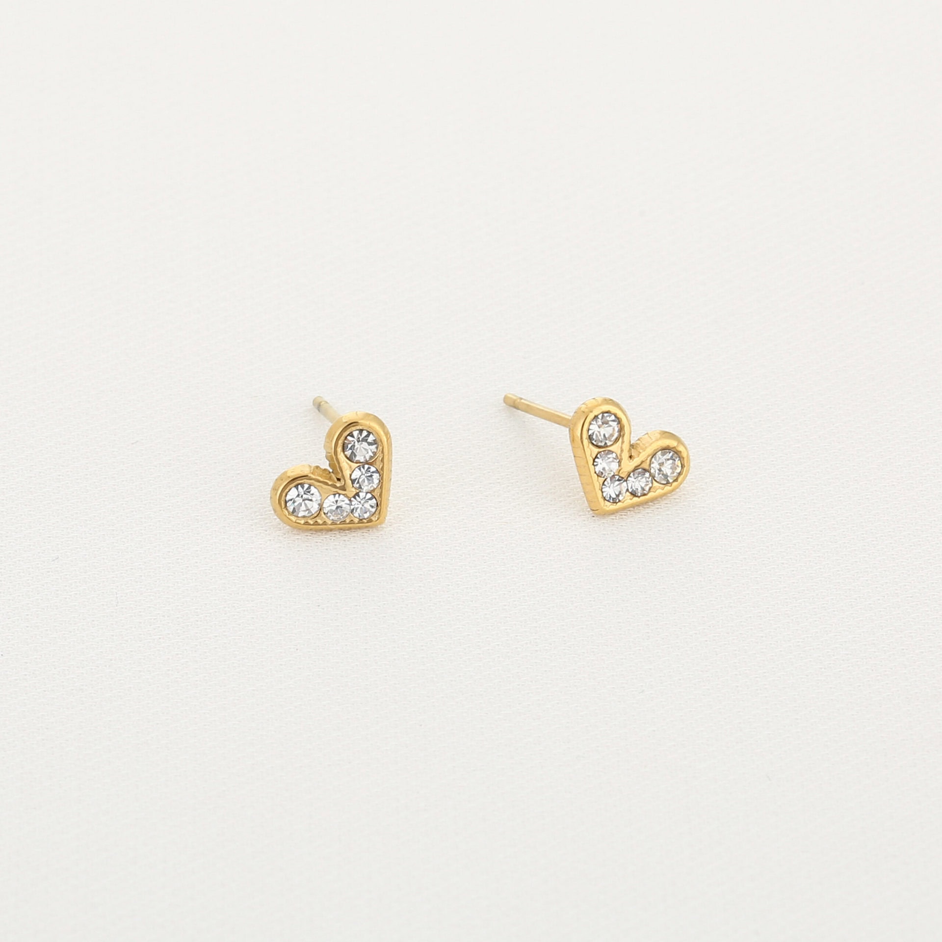 Hartjes studs met strass. Kleine oorstekers in de vorm van een hartje en bezet met strass steentjes. De oorbellen zijn gemaakt van Stainless steel, dus verkleuren niet. De afmeting is 0,7 cm.