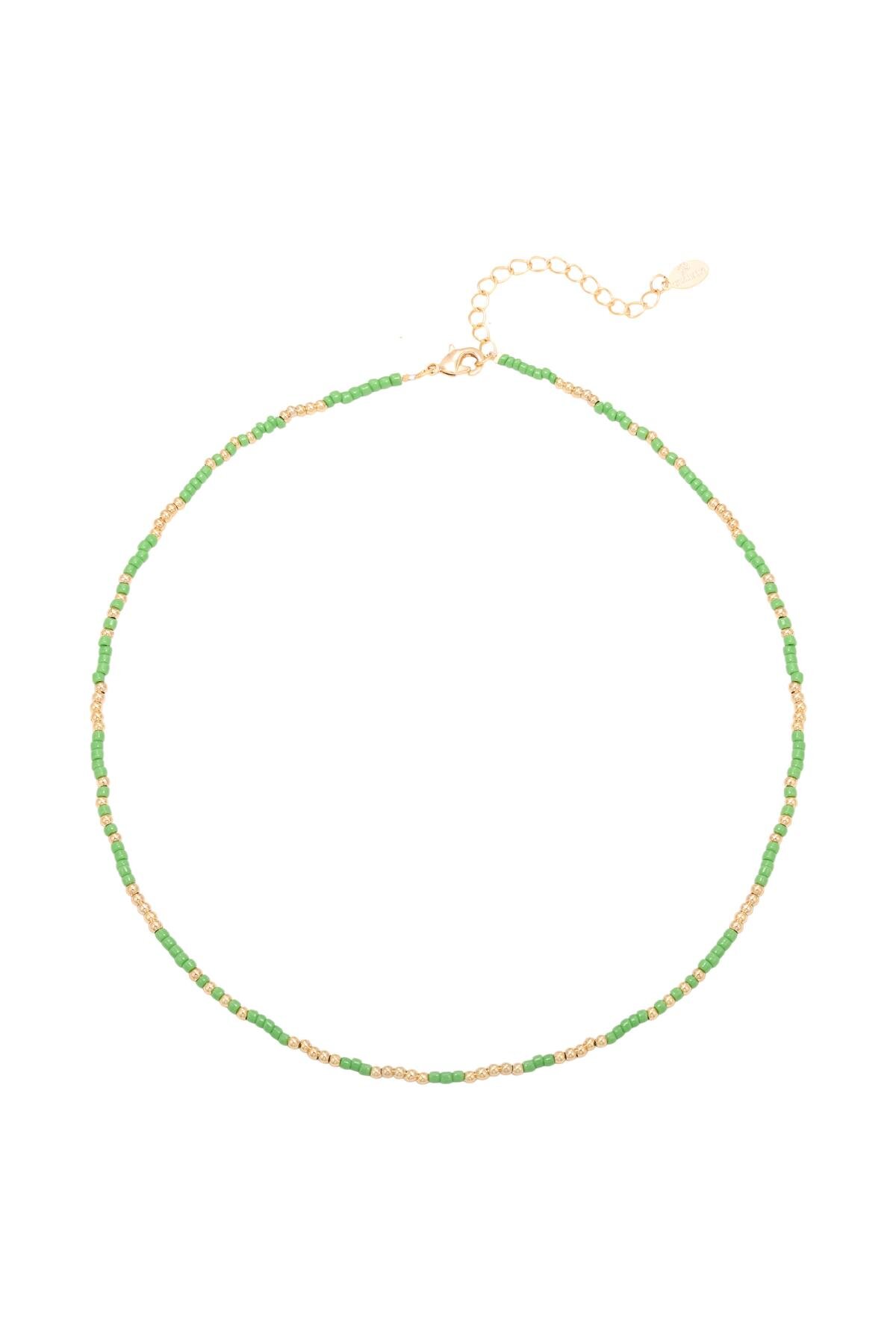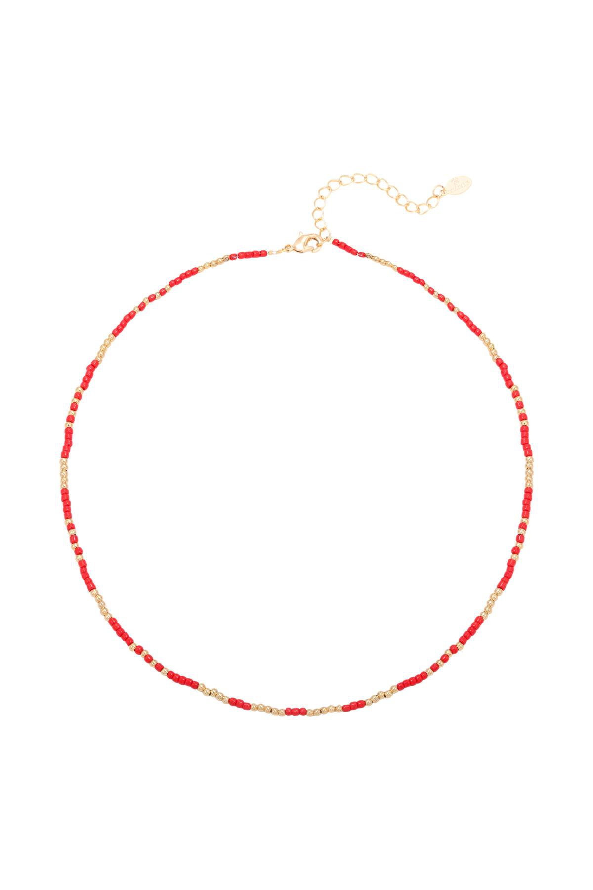 Ketting Mystic Beads in groen en rood. Deze korte ketting is gemaakt van leuke parelkraaltjes en een koperen sluiting. Lengte is verstelbaar van 37 tm 42 cnn en je shopt hem in rood/goud en groen/goud.
