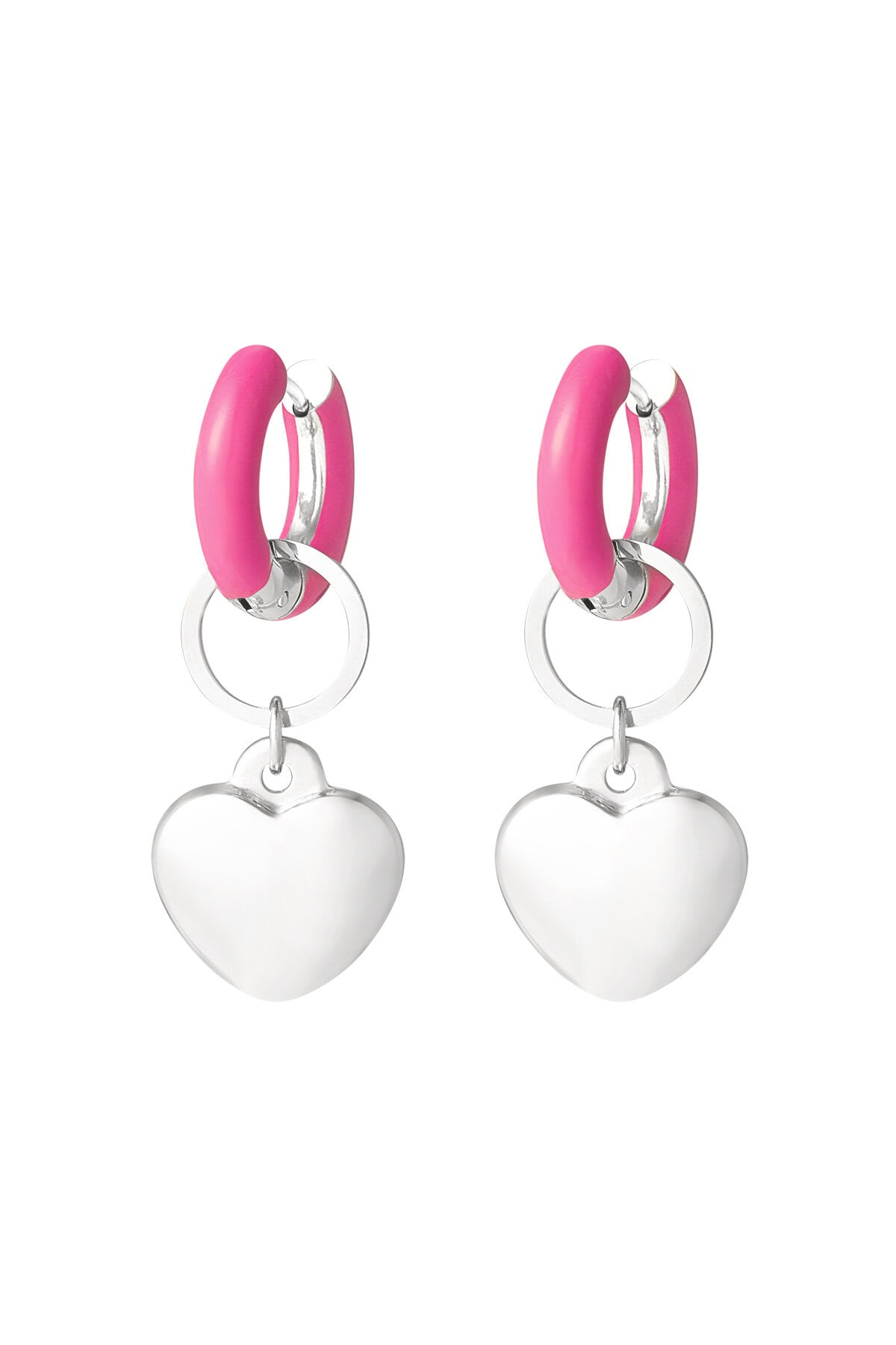 Oorbel roze met zilveren hart. Voor degene die op zoek zijn naar zilveren oorbellen met een kleurtje zijn deze roze ringetjes met een hartjesbedel uit de mess collectie een musthave!