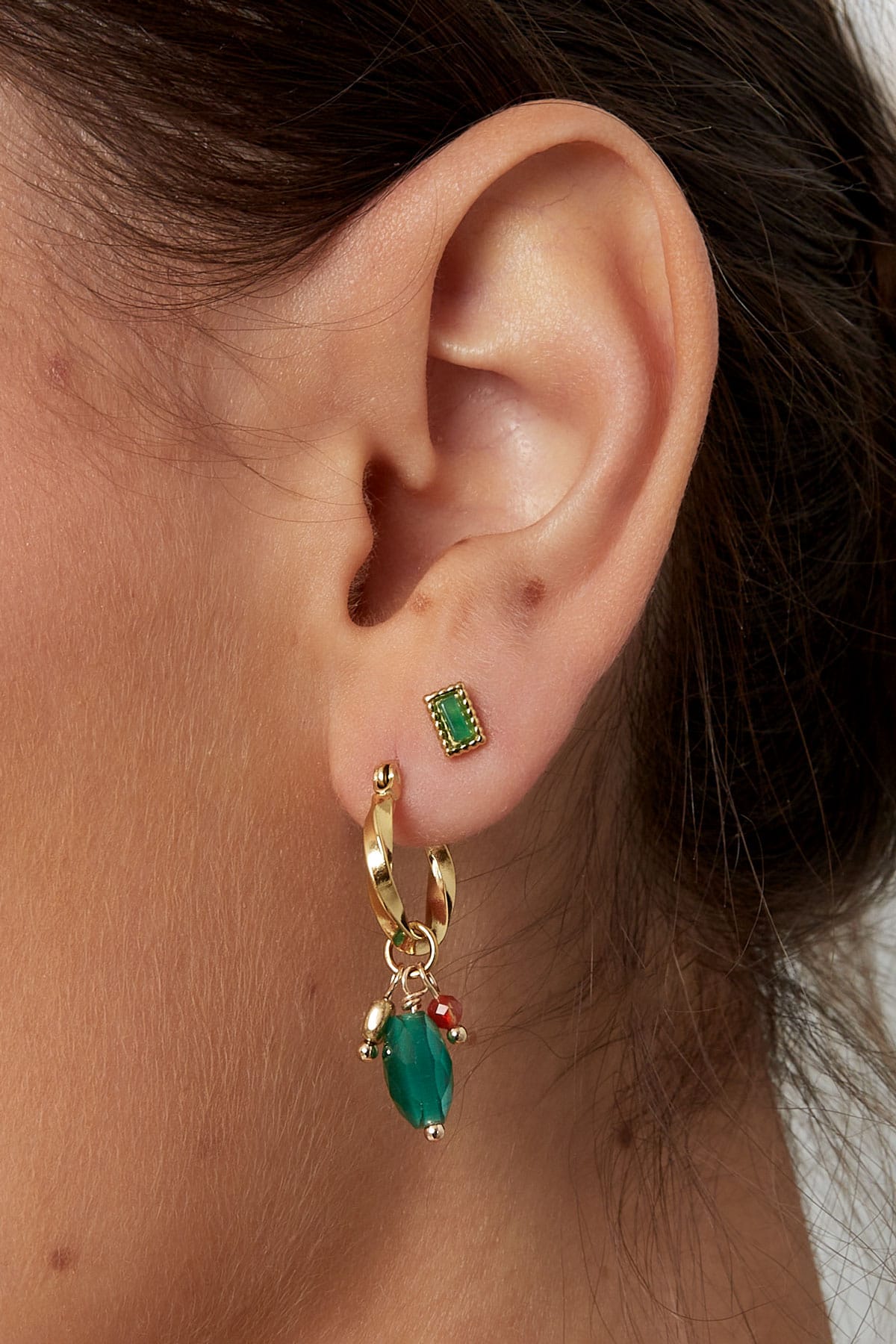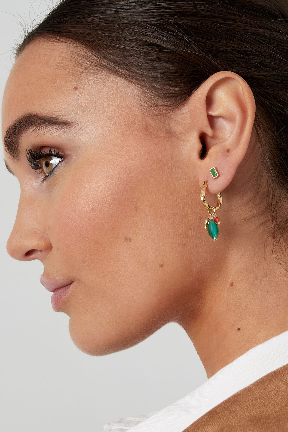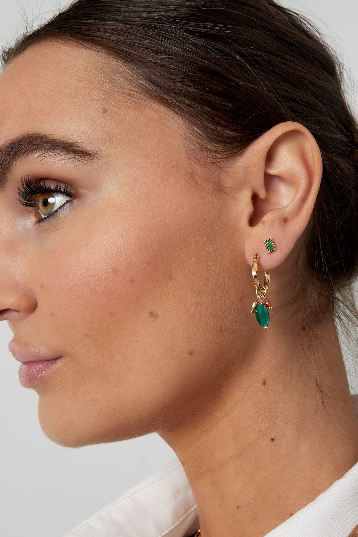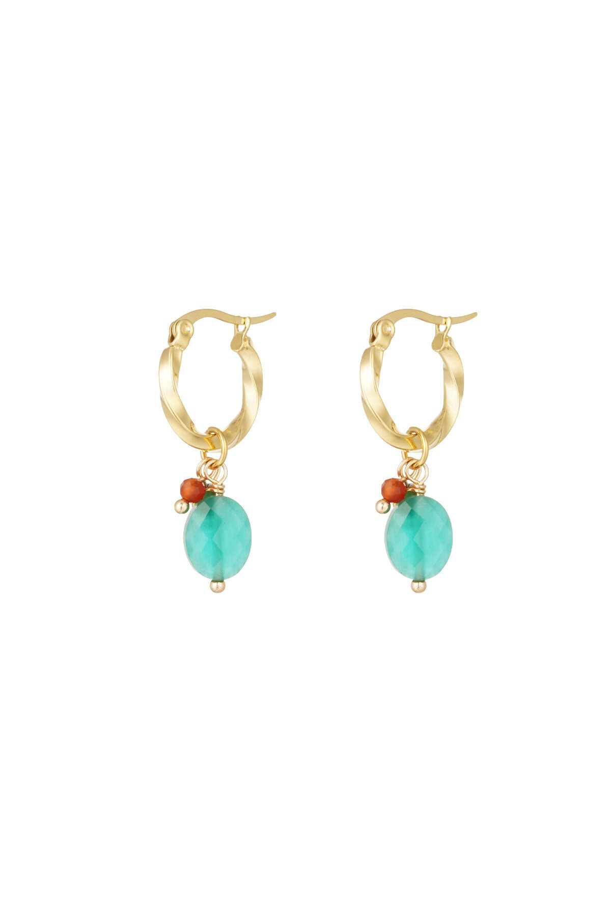 Oorbellen met een twist en blauw/groene steen. Hoops met en twist en een grote blauw/groene steen en kleine gekleurde steentjes. Materiaal: Stainless Steel, Hematiet, Kristal en Steen. Afmeting 1,4 x 3 cm. Je shopt ze in goud en zilver.