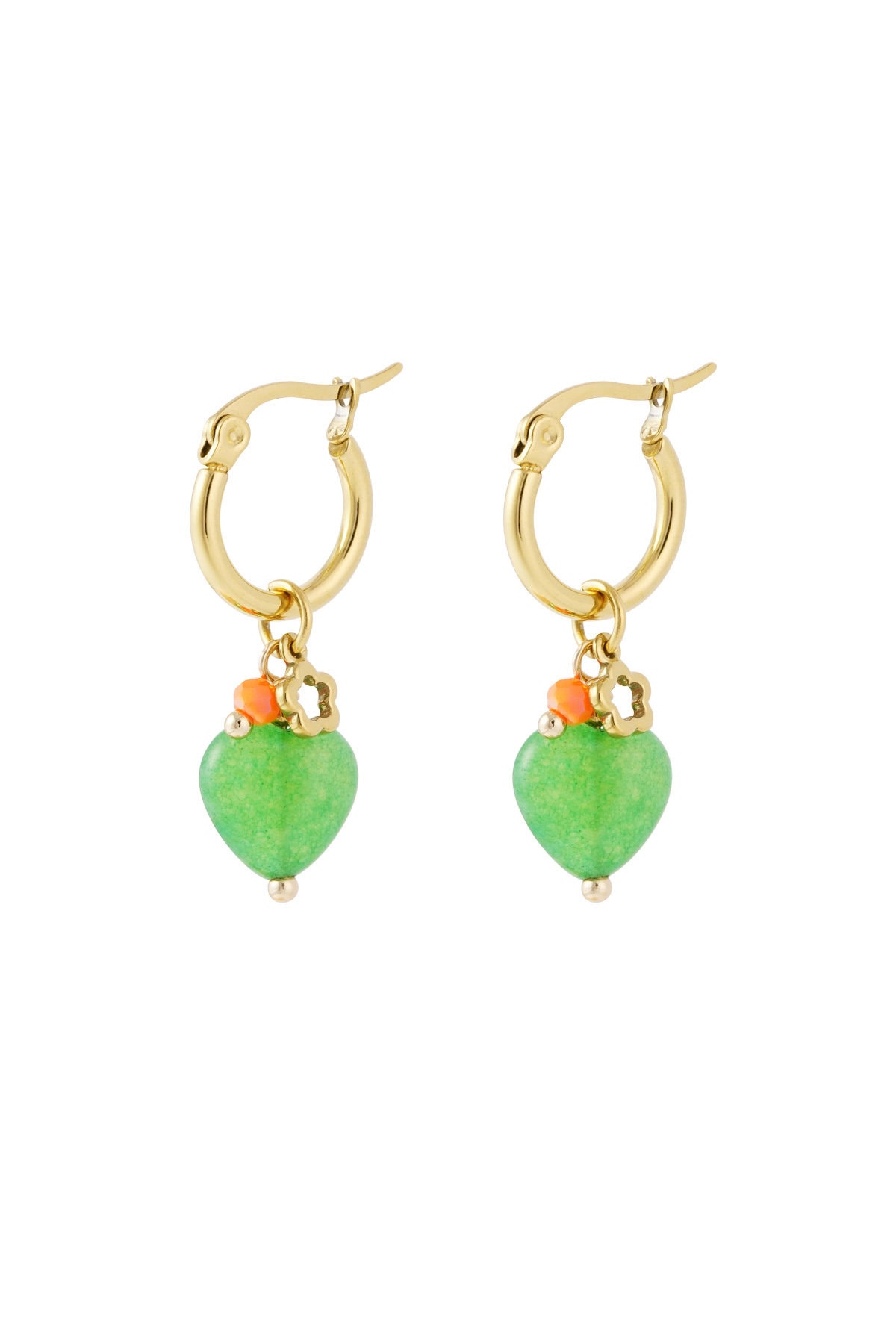 Oorbellen met hartje en bloem. Leuke kleine oorbelletjes met hartje en een groene bloem. Materiaal: stainless steel, steen, kristal en hematiet. Lengte 3,1 cm. Verkrijgbaar in goud en zilver.