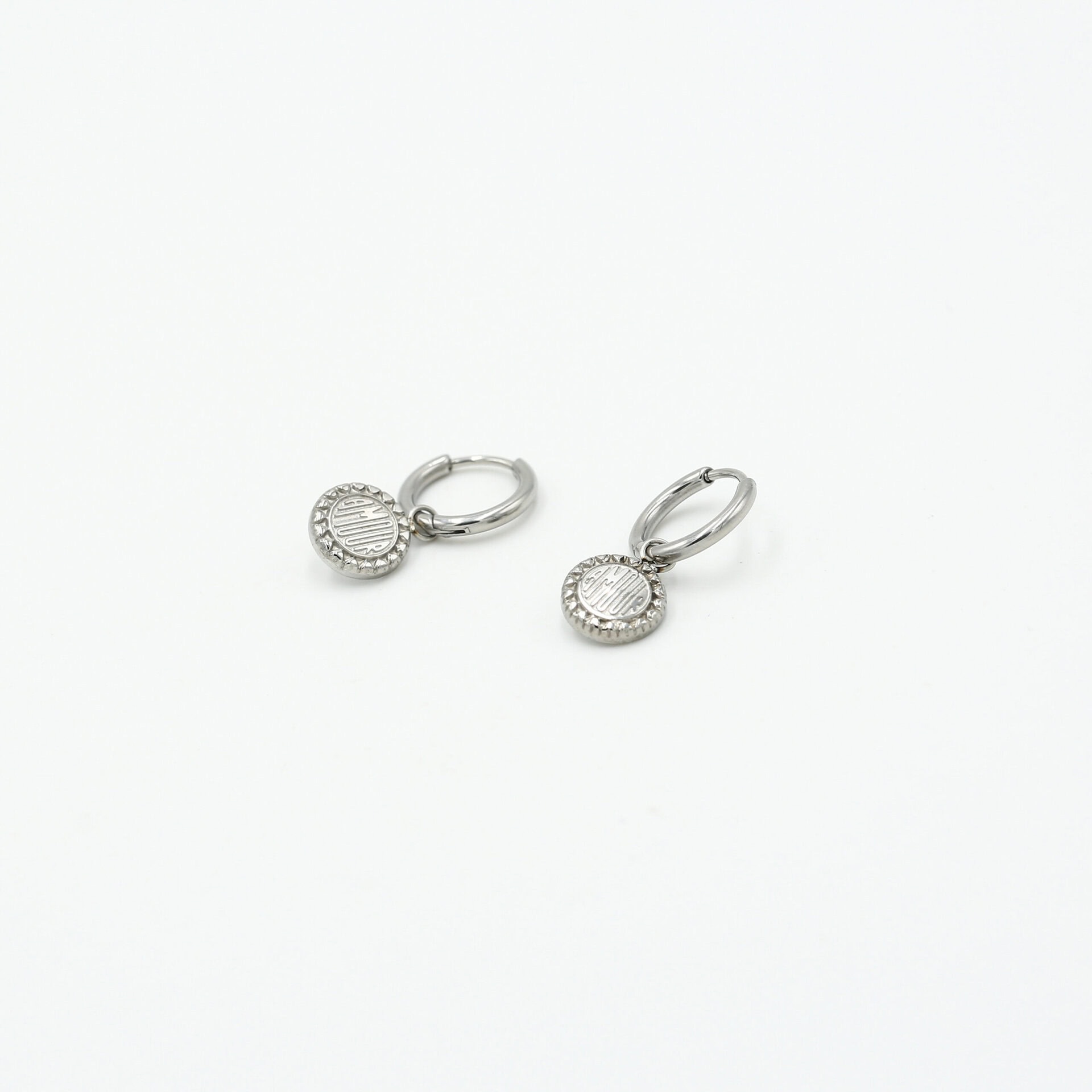 Oorbellen met muntje Amour. Kleine zilveren oorringetjes met een muntje met de tekst Amour. Gemaakt van Stainless Steel.