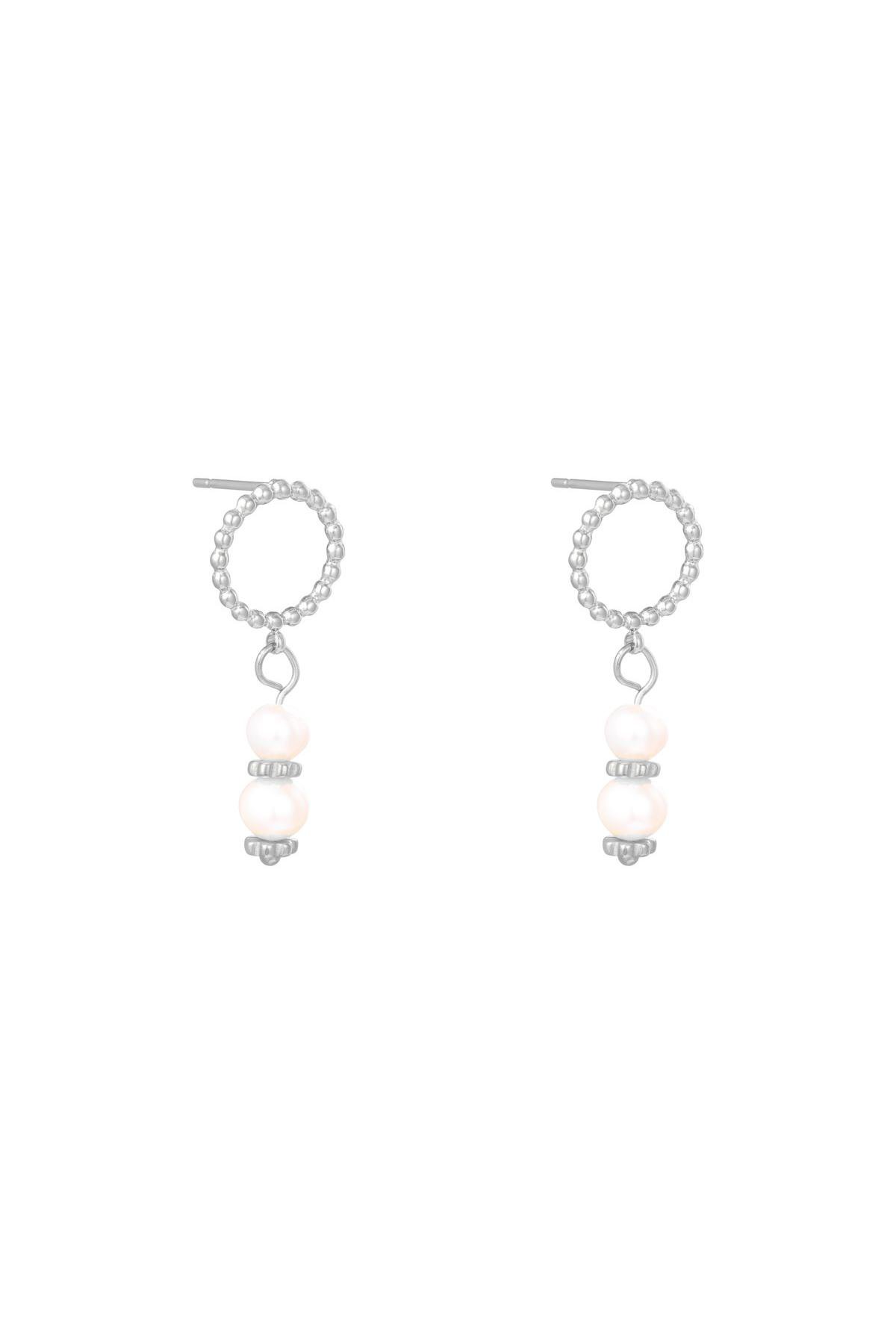 Oorbellen Pearl Spheres. Cirkelvormige oorknop van stainless steel met bedel van parelbolletjes. Verkrijgbaar in de kleur zilver.
