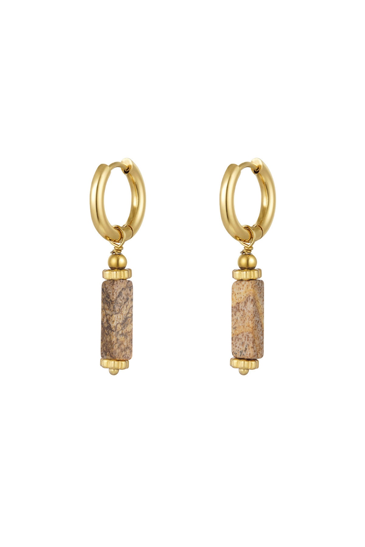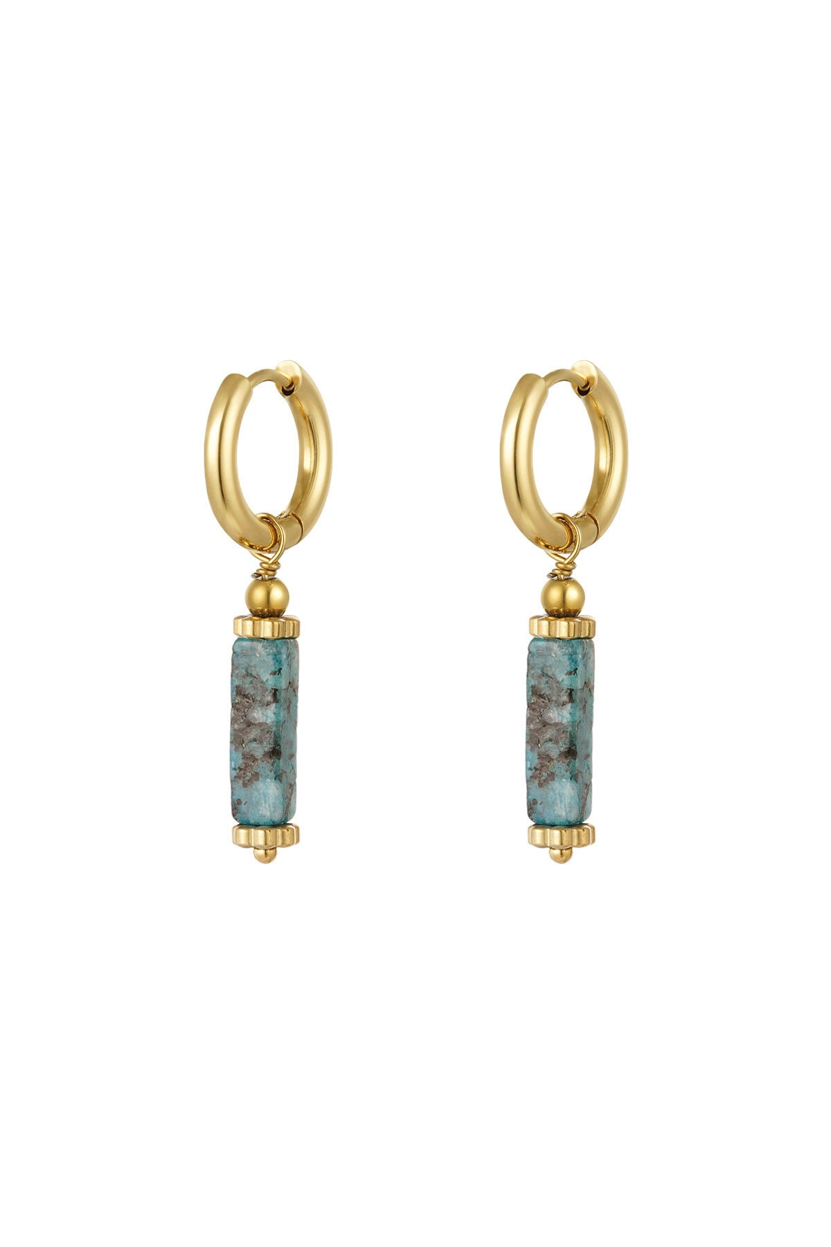 Oorbellen rechthoekige steen, Natuurstenen collectie. Prachtige gouden oorbellen met een rechthoekige steen in diverse kleurtjes. Deze oorbellen zijn bij elke outfit een echte aanrader. De oorbellen zijn bijvoorbeeld leuk te combineren met kleine gouden ringetjes! Ook kun je meerdere sieraden met groene details dragen voor een kleurrijke look. Oorbellen rechthoekige steen zijn gemaakt van stainless steel, hematiet en african pine stone en hebben een afmeting van 3,7 cm.