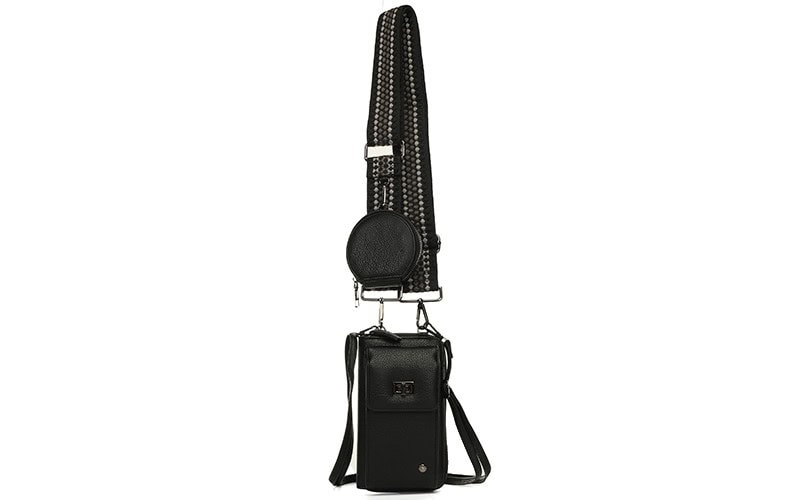 "Estelle" is weer een nieuw prachtig staand model portemonnee en telefoontasje in de I'm Dutch collectie. Estelle is een klein en fijn tasje voor het opbergen van je telefoon, pasjes, geld en andere waardevolle bezittingen. De stijlvolle portemonnee biedt bovendien ruimte voor een Samsung en iPhone telefoon. Controleer wel even de afmetingen. Je kunt je telefoon kwijt in het ruime middenvak of in het voorvak onder de flap. De flap van het voorvak wordt met een unieke draaisluiting afgesloten en biedt een veilige, maar toegankelijke plek voor je telefoon. De portemonnee wordt geleverd met twee verschillende schouderbanden, een vrolijke brede geweven band en een smallere effen schouderband en een klein rond portemonneetje. De portemonnee / telefoontas is uitgevoerd in een hoge kwaliteit PU materiaal.